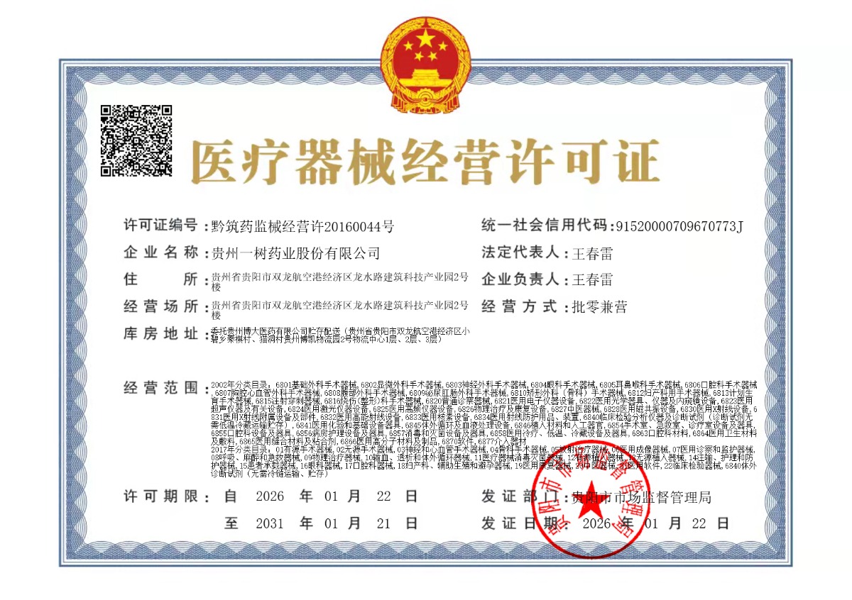 医疗器械经营许可证:黔食药监械生产许20160044号